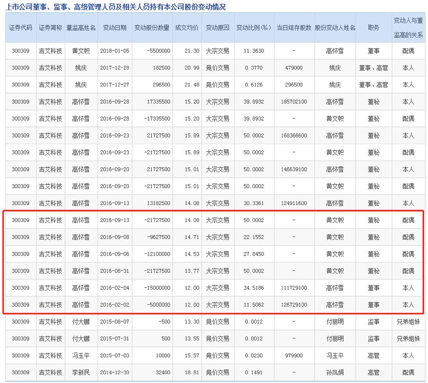 2018年3月23日,實控人高懷雪公告稱通過大宗交易分別減持了550萬股和2450萬股給四川信托-吉艾科技員工持股1號集合資金信托計劃和總經(jīng)理姚慶,共計減持了6.2%的股份。此次協(xié)議轉(zhuǎn)讓也引來了交易所的問詢。深交所的關注點包括姚慶的資金來源、是否為股權代持等。