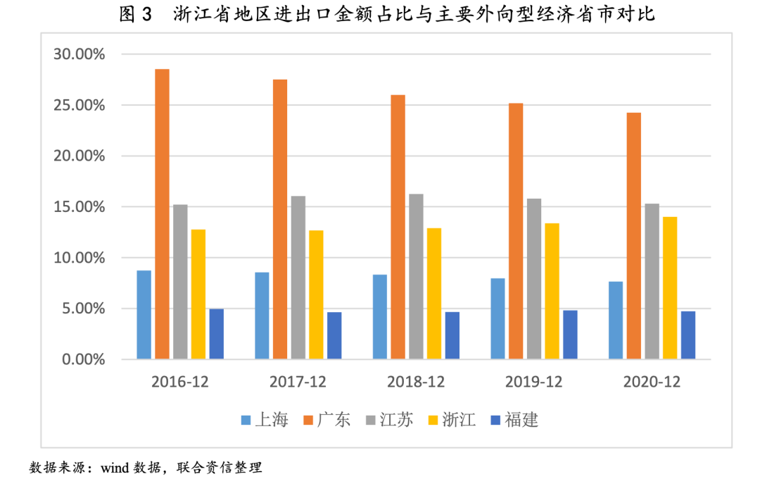 浙江省經濟的高質量發展,一方面與民營經濟的活力緊密相連,另一方面與其自身的外向型經濟發展密不可分。2017年4月,中國(浙江)自由貿易試驗區掛牌成立,并于2020年在全國率先實現擴區,擴區后涵蓋寧波片區、杭州片區和金義片區,分別在國際航運樞紐、人工智能、國際金融科技發展、跨境電商、數字經濟以及小商品自由貿易中心、數字貿易創新等多個領域進行發展。隨著各項政策的落地,或將進一步促進浙江省外向型經濟的發展。從數據來看,浙江省進出口金額占全國進出口金額的比例維持在12%以上,并且呈逐年上升態勢,與江蘇的差距逐年拉進。但另一方面,鑒于近年來中美關系的緊張以及全球疫情的擴散對進出口貿易的影響,未來浙江省外向型經濟發展動力或將面臨一定挑戰。