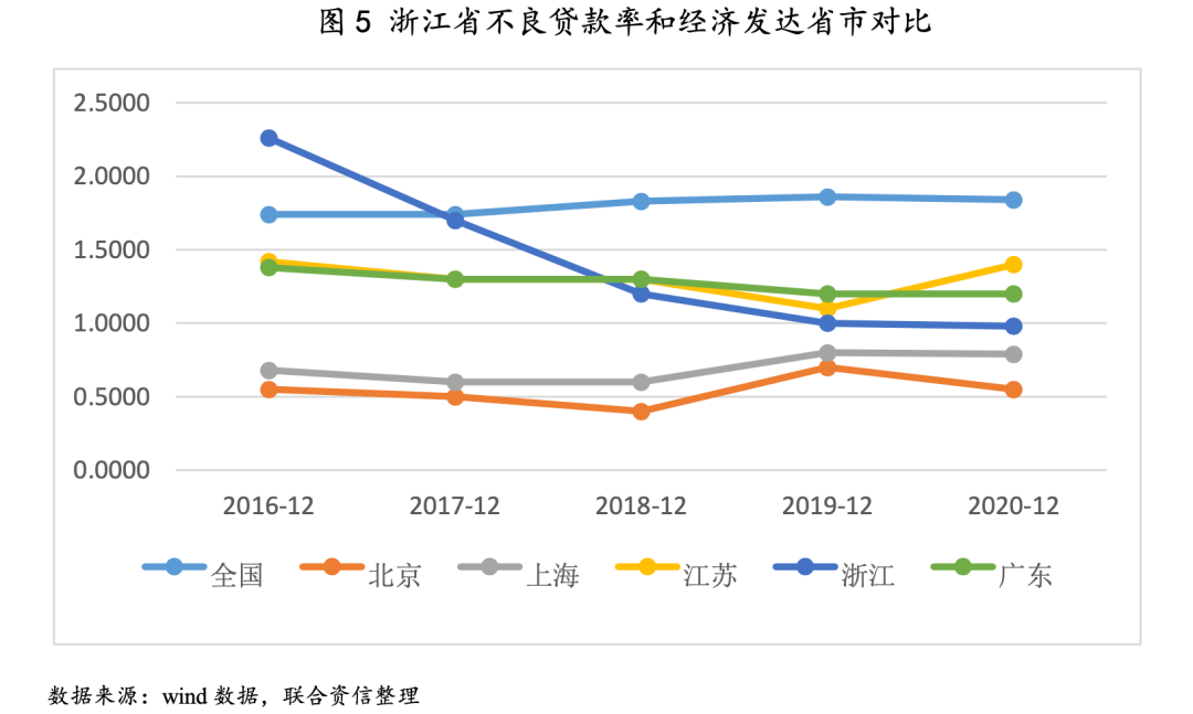 得益于較高的經濟發展水平以及自身產業較為成熟等因素,浙江省銀行業金融機構信貸資產質量保持在較好水平;但另一方面,由于外向型經濟對國際經濟與政治環境依關聯度較高,在中美貿易戰升級以及疫情環境下產業鏈轉移背景下,企業或面臨一定經營壓力,從而對銀行業資產質量維持產生不利影響。2018年以前,由于浙江地區民間借貸以及擔保互保現象普遍,在當時“三去一降一補”的大政策背景下擔保鏈出現斷裂,導致省內銀行業資產質量承壓,整體信貸資產質量低于全國平均水平。近年來,隨著互保鏈的解開以及銀行加大對不良信貸資產的處置清收力度,整體信貸資產質量明顯改善,不良率顯著下降。目前來看已經優于全國平均水平,與經濟發達省市相比而言,貸款資產質量要優于廣東和江蘇。2020年以來,受經濟下行壓力影響疊加新冠肺炎疫情沖擊,全省銀行業金融機構不良貸款余額和不良貸款率略有上升。根據《浙江省金融運營報告(2021)》,2020年,浙江省銀行業金融機構全年共處置不良貸款1429.1億元,同比增加70.0億元;截至2020年末,浙江省銀行業金融機構不良貸款余額為1402.0億元,不良貸款率為0.98%,比年初上升0.07個百分點。但浙江省的外向型經濟使得區域內企業對于進出口貿易依賴度較高,當前中美貿易戰逐漸升級,部分以美國為核心的貿易組織嘗試逐步降低對華貿易依賴度,同時伴隨著疫情環境下運輸成本上升和產業鏈向馬來西亞、印尼等國家轉移,浙江省與外貿密切相關的企業或將面臨一定沖擊。需關注在當前經濟環境和政治局勢下,企業經營壓力上升給浙江省銀行業信貸資產質量帶來的負面影響。