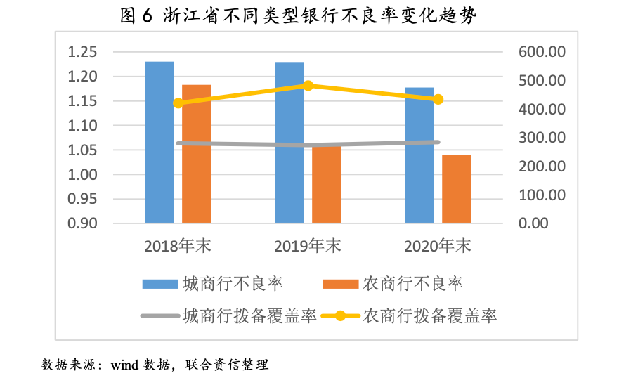 浙江省銀行業不良基本維持穩定,城商行和農商行信貸資產質量改善程度有所差別,得益于2018—2019年農商行改制以及不良處置力度加大,農商行不良率下降較為顯著。分層來看,以本文所選取樣本為例,浙江省城市商業銀行不良貸款率呈持續改善態勢,農商銀行2018—2019年大規模的清收與核銷不良貸款,同時部分農商行于2018年左右進行改制,通過政府入股以及股東購買等形式消化不良,使得不良貸款率前期下降明顯;而城商行信貸資產質量較為平穩,逐步改善,整體而言城商行和農商行不良貸款率逐漸趨近。具體而言,根據樣本數據,對于規模較大的農商銀行不良率受疫情影響較大,主要是由于規模較大的農商銀行資本實力相對較強,因此參與企業授信規模較多,在疫情以及產業鏈轉移影響下,大額信貸風險有所暴露,導致較大規模的農商行不良率下降相對較緩。從樣本中的貸款撥備情況來看,截至2020年末,浙江省城商行的撥備覆蓋率處在200%至300%區間較多,而寧波銀行和杭州銀行作為頭部城商行,撥備情況明顯優于其他城商行;浙江省的農村商業銀行撥備情況相對更充足,撥備覆蓋率處在300%以上的占比高。整體來看,浙江省銀行貸款撥備保持在充足水平。