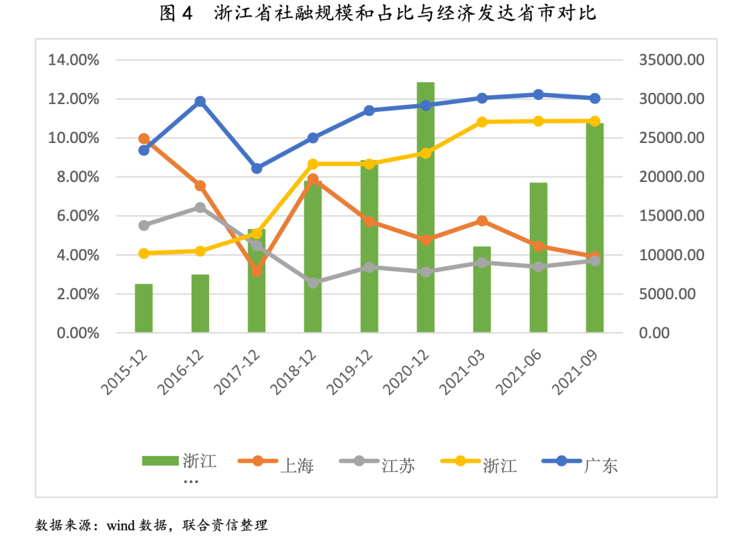 從金融業發展角度來看,浙江省較為突出的區位優勢,以及領先的經濟增速為地方金融行業發展奠定了良好的經濟基礎。近年來,浙江省金融業整體發展平穩,對實體經濟的支持力度不斷攀升,自2016年以來浙江省社融規模呈快速增長態勢,并且其社融占全國社融的比例明顯高于上海和浙江等經濟發達省市。較好的社融增長體現了浙江地區金融體系對實體經濟的強有力的支持能力。