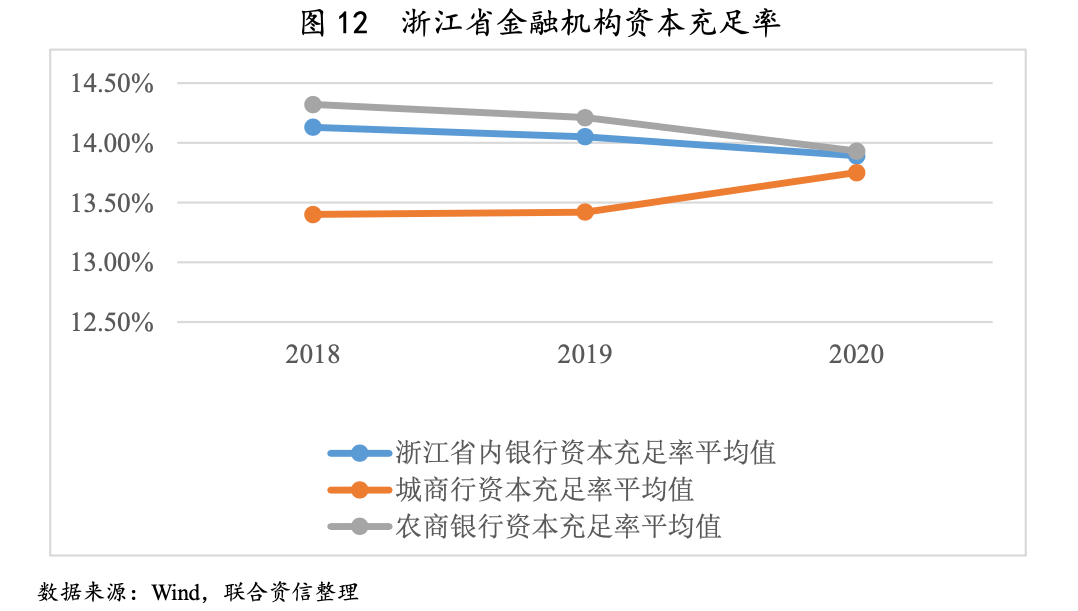 從浙江省內城商行及農商銀行資本充足率平均值差異情況看,近年來,浙江省內農商銀行資本充足率平均值略高于城商行資本充足率平均值水平,一方面系農商銀行個體體量相較城商行而言體量相對較低,對具有一定規模或資金需求相對較高的客戶服務能力相對較弱,且農商銀行主要集中于地方縣域,客戶類型中涉及風險權重相對較小的小微企業及個體工商戶等占客戶總量比重相對較高,帶來的資本消耗相對較低。但是,近年來,浙江省內城商行資本充足率平均值呈上升趨勢,一方面系城商行近年來業務拓展相較于省內農商銀行而言在資本消耗力度方面相對較高,對資本補充需求高于省內農商銀行,且浙江省內城商行多由地方政府參股,相較于普遍由民營股東組成且股權結構散的省內農商銀行而言,省內城商銀行股東增資意愿相對較高,相對較易獲得來自股東的資本補充。