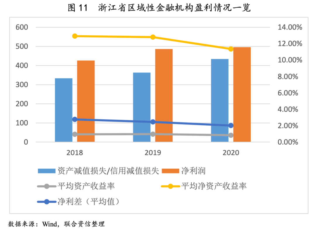 浙江省內區域性銀行收入結構相對較好,盈利能力相對較強;但凈利差有所收窄,且較高的減值準備計提不利于盈利能力體現。從選取樣本中反映的收入結構看,近年來,浙江省內區域性銀行利息凈收入、手續費與傭金凈收入和投資收益之和呈逐年上升的態勢。其中,利息凈收入仍為浙江省內區域性銀行的主要收入來源,且占三類收入渠道之和的比重呈小幅提升的態勢,2018、2019和2020年利息凈收入分別占當年營業收入的68.67%、67.68%和71.89%;投資收益增速及占三類收入渠道之和的比重有所下降,但投資收益占三類收入渠道之和的比重相對適中,2018、2019和2020年投資收益分別占當年營業收入的23.06%、22.35%和22.51%;手續費及傭金凈收入占三類收入渠道之和的比重持續保持在相對較低水平。從收入結構可以得出,浙江省內區域性銀行在保證信貸資產投放能夠帶來良好收益的同時,對于富余資金的營運能力相對較強,整體收入結構相對良好。近年來,在國家倡導金融機構服務實體經濟,讓利于實體經濟、小微企業等政策的持續推進,以及浙江省地方法人金融機構已于2020年內完成存量浮動利率貸款定價基準的轉換的影響下,浙江省內區域性金融機構貸款定價水平持續下降,疊加同業攬存競爭力持續上升帶來的負債成本增長,共同導致近年來利差水平持續縮窄,2018、2019和2020年凈利差平均值分別為2.77%、2.46%和2.02%。此外,浙江省區域性金融機構持續加大資產減值損失的計提力度(見圖10),對利潤實現形成一定影響,近年來凈利潤增速明顯下降,相關收益率指標有所下降,但相較于其他地區同業機構來看,仍處在相對較好水平。
