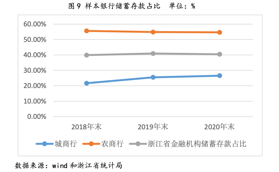 從存款結構來看,公司存款的拉動作用較為突出。截至2020年末,浙江省金融機構本外幣存款余額15.23萬億元,較上年末增長15.94%,增速較上年略有提升。其中,住戶存款占比40.44%,增速較去年有所下滑。從樣本數據來看,不同類型銀行的存款來源具有一定差異性,城商行對儲蓄存款的依賴性相對較低,農商行相對更多的依賴儲蓄存款。主要是因為農商行在較為下沉的網點覆蓋面上而言具有一定的個人客戶營銷優勢,而城商行在資本實力以及與政府合作方面具備較強競爭力,因此公司存款為此類銀行的主要來源。整體而言,得益于浙江省區域經濟保持較強活力,銀行業在存款發展上面臨的壓力相對較小;同時整體儲蓄存款維持在40%以上,存款穩定性較好,并且中小型農商銀行擁有更高的個人存款占比,存款穩定性更強。但同時儲蓄存款一般具有更高的存款成本,也在一定程度上推高了中小農商銀行的負債成本。