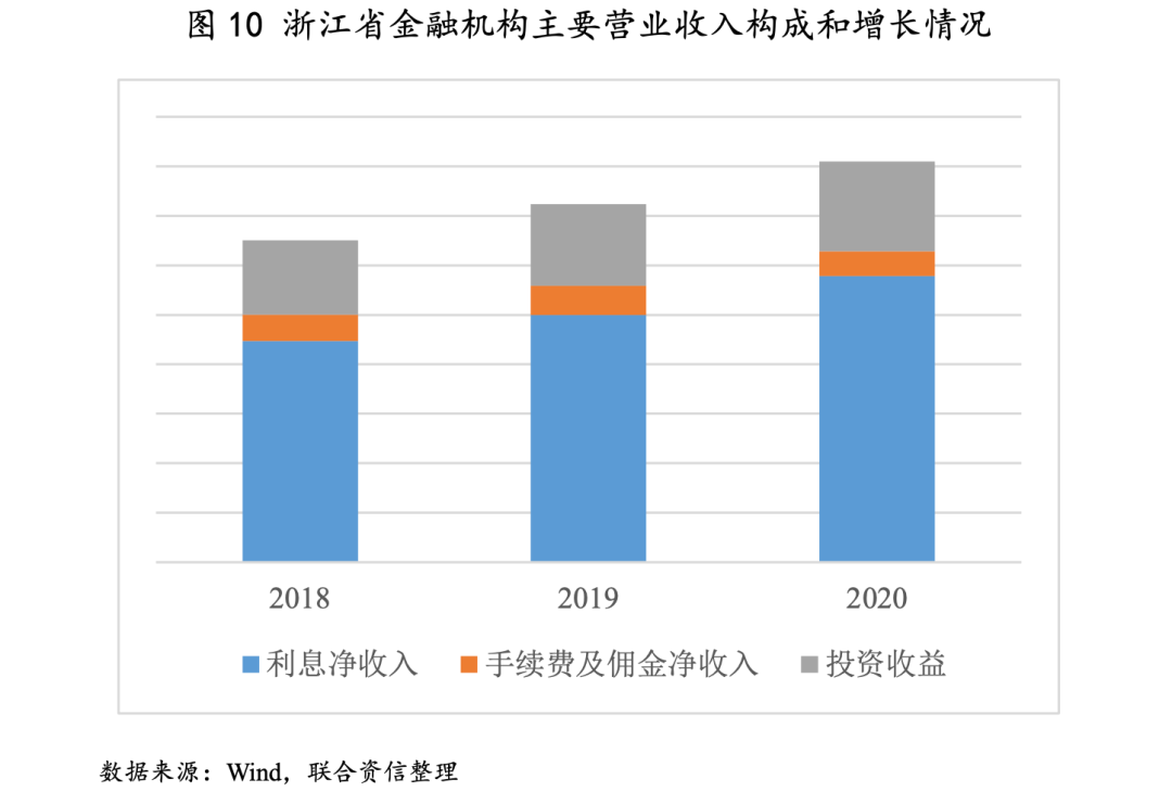 3.浙江省銀行業收入實現能力較好,收入結構較為穩定,隨著業務回歸本源,利息凈收入占比上升;同業競爭加劇、利率市場化以及減費讓利政策均對銀行業利潤空間形成擠壓。