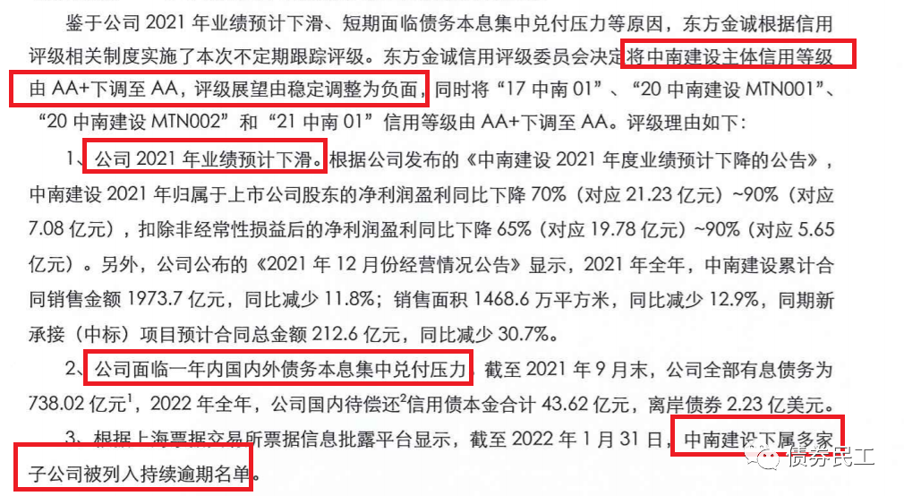 此前的2022年2月24日,東方金誠披露了《關(guān)于下調(diào)江蘇中南建設(shè)集團(tuán)股份有限公司主體及相關(guān)債項(xiàng)信用等級的公告》,將中南建設(shè)的主體信用等級由AA+下調(diào)至AA,并將評級展望調(diào)整為負(fù)面。本次評級下調(diào)的主要原因是公司2021年業(yè)績預(yù)計(jì)下滑、面臨集中兌付壓力、子公司被列入票交所逾期名單等。