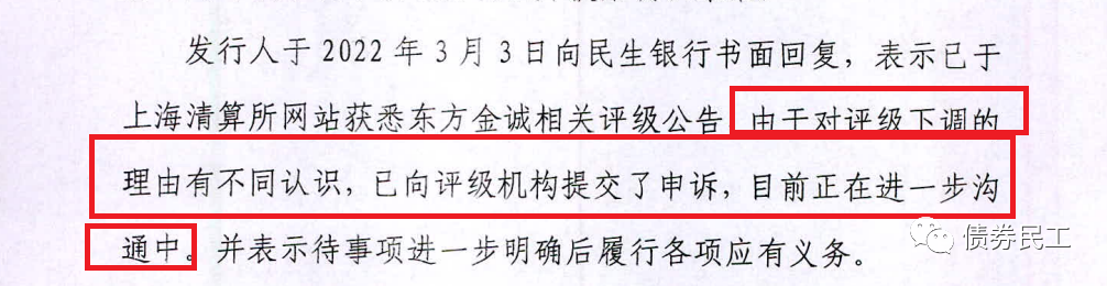 2022年3月7日,江蘇中南建設(shè)集團(tuán)股份有限公司(以下簡稱“中南建設(shè)”)披露《中國民生銀行股份有限公司關(guān)于東方金誠國際信用評估有限公司下調(diào)江蘇中南建設(shè)集團(tuán)股份有限公司主體及相關(guān)債項(xiàng)信用等級觸發(fā)投保條款事項(xiàng)的公告》,明確提出“對于評級下調(diào)的理由有不同認(rèn)識,已向評級機(jī)構(gòu)提交了申訴”。也就是說,發(fā)行人對評級結(jié)果提出了異議。