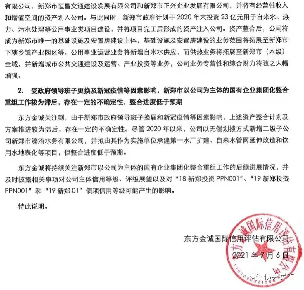 東方金誠于2021年7月6日出具了關(guān)于《新鄭新區(qū)發(fā)展投資有限責(zé)任公司關(guān)于東方金誠國際信用評估有限公司調(diào)整公司評級展望的公告》事項(xiàng)的說明,對新鄭投資的公告進(jìn)行了回復(fù):一是公司的作業(yè)流程已經(jīng)履行了現(xiàn)場訪談和征求意見等必要程序,二是因?yàn)樾锣嵧顿Y的集團(tuán)化整合重組工作較為滯后,評級調(diào)整理由充分。