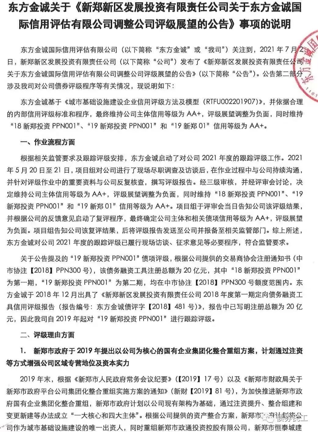 2021年6月29日,東方金誠的跟蹤評級報(bào)告評定新鄭新區(qū)發(fā)展投資有限責(zé)任公司(以下簡稱“新鄭投資”)發(fā)行的“18新鄭投資PPN001”和“19新鄭投資PPN001”的主體評級為AA+,評級展望由穩(wěn)定調(diào)整為負(fù)面。新鄭投資在2021年7月2日發(fā)布了《關(guān)于東方金誠國際信用評估有限公司調(diào)整公司評級展望的公告》,明確申明了兩個特別說明:一是新鄭投資認(rèn)為 “19新鄭投資PPN001”未做債項(xiàng)評級安排;二是新鄭投資認(rèn)為東方金誠跟蹤評級未進(jìn)行現(xiàn)場盡調(diào)訪談、也未征求公司意見,評級報(bào)告出具未履行必要流程,正在申請復(fù)議中。