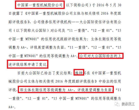 從實(shí)踐來看,信用債券市場上發(fā)行人對于評級機(jī)構(gòu)的評級結(jié)果公開提出異議的情況并不多。債券民工印象中比較深的發(fā)行人對信用評級就結(jié)果公開提出異議并進(jìn)行復(fù)議的是中國第一重型機(jī)械股份公司在2016年對評級結(jié)果提出了異議并進(jìn)行復(fù)議,但是復(fù)議結(jié)果還是維持了主體長期信用等級為AA-,評級展望調(diào)整為負(fù)面的結(jié)果。