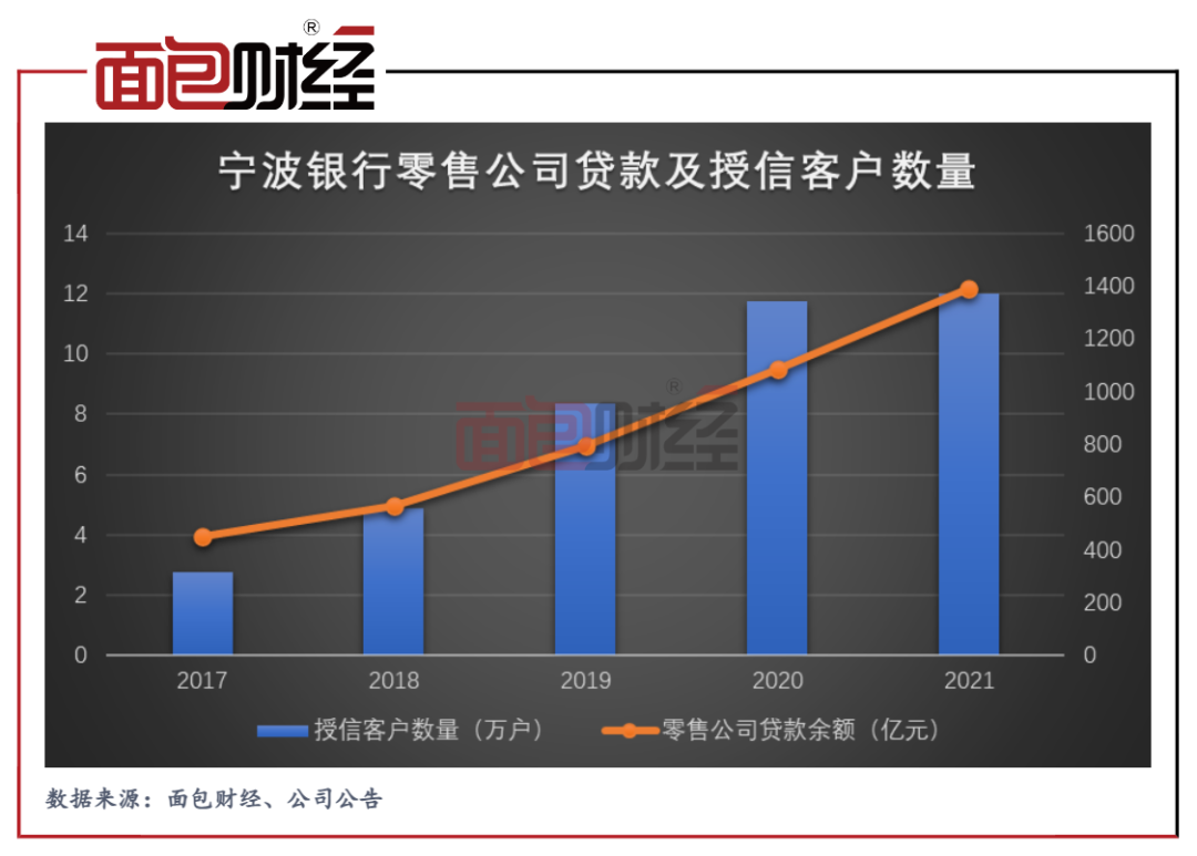 報告期內,該行加大資源傾斜,增加普惠小微貸款的投放力度,不斷優化小微企業融資的產品、流程和服務。截至2021年末,寧波銀行報告期末,零售公司授信客戶12萬戶,貸款余額1392億元,較上年末增加307億元,增幅為28%。