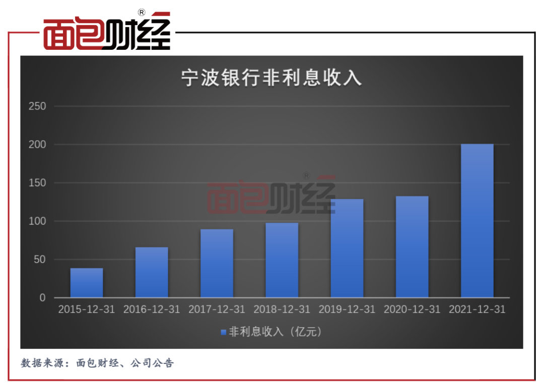 年報顯示,得益于盈利結構的持續優化,該行大零售及輕資本業務的盈利占比不斷提升,非息收入持續提升。2021年,寧波銀行實現非利息收入200.77億元,同比增長51.5%,在營業收入中占比為38.04%。其中手續費及傭金凈收入82.62億元,同比增長30.27%。
