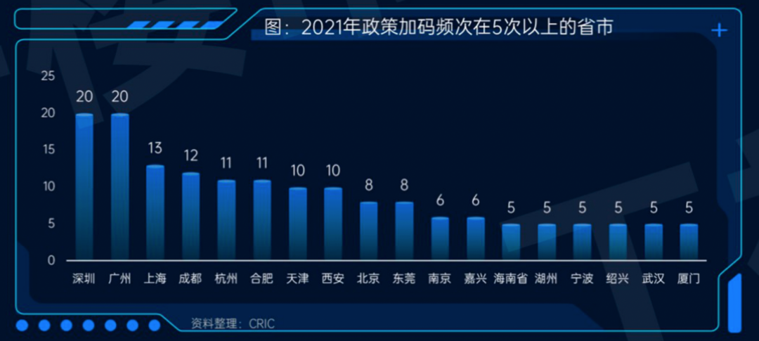其中,深圳、廣州政策加碼多達(dá)20次,深圳重點(diǎn)強(qiáng)化信貸資金管控,并以“深房理”被查處作為政策加碼的最高峰;廣州分區(qū)域精準(zhǔn)化調(diào)控,天河、黃埔、南沙等熱點(diǎn)區(qū)域依據(jù)市場實(shí)際情況,針對性地調(diào)整政策措施;上海多管齊下嚴(yán)堵政策監(jiān)管漏洞,政策加碼同樣達(dá)到13次。