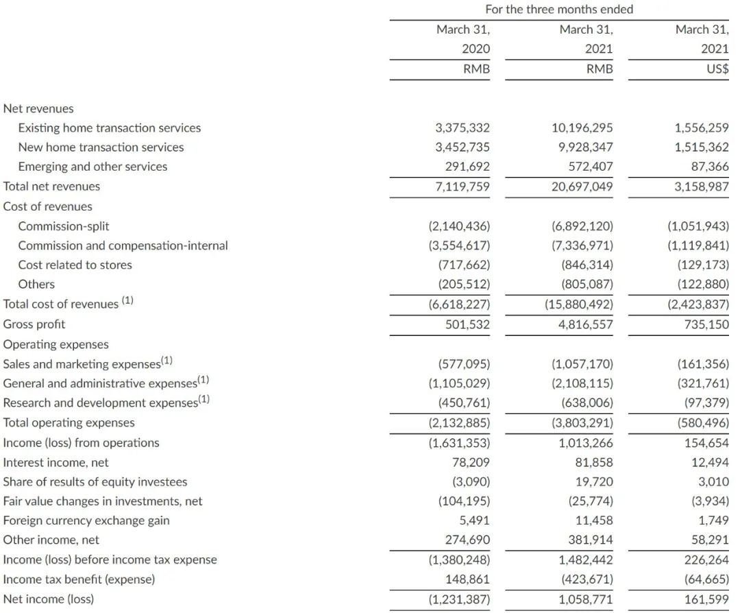 5月19日,貝殼找房發布了2021年第一季度未經審計的財務業績: