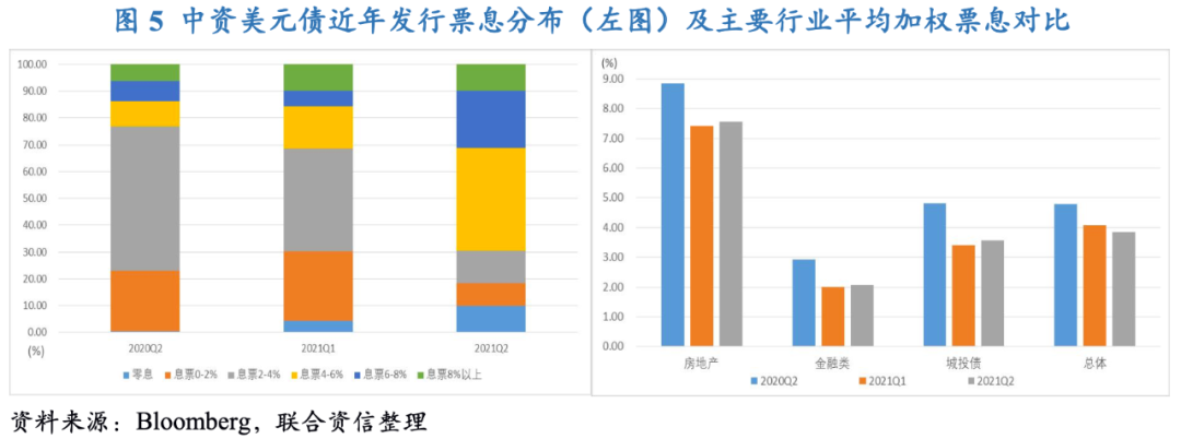 2021年二季度,美債收益率總體呈下行趨勢,受此影響中資美元債融資成本繼續下降,平均發行票息為3.8%,環比和同比分別下降24.8個和94.8個BP,創有數據統計以來的最低發行成本紀錄。