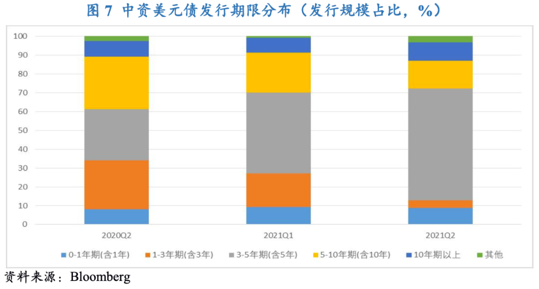 從發行票息分布來看,2021年二季度,發行票息在0~2%、2~4%、4~6%、6~8%、8%以上的發行規模占比分別為8.5%、12.2%、38.3%、21.5%和9.7%,其中零息債券占比9.9%。具體來看,本季度中資美元債發行成本以中高票息為主,發行票息大于4%(含)的債券規模占比高達69.5%,環比和同比分別增加38.0和46.3個百分點;本季度,發行期限向中長期聚集,短期限區間大幅收窄。一方面,發行票息在4~6%之間為中資美元債的高發區間,占總發行規模的38.3%,環比和同比分別增長22.5個和28.7個百分點;發行票息在6~8%之間的高票息區間呈現走擴趨勢,占總發行規模的21.5%,環比和同比分別增長15.8個和14.1個百分點;發行票息在8%以上的高票息占總發行規模的9.7%,環比下降0.2個百分點,同比增長3.5個百分點。另一方面,發行票息在2~4%之間的低票息區間呈現大幅收窄趨勢,占總發行規模的12.2%,環比和同比分別大幅下降26.0個和41.7個百分點;發行票息在0~2%之間的低票息區間也顯著回落,占總發行規模的8.5%,環比和同比分別大幅下降17.5個和14.1個百分點;低票息債券中唯獨零息債券規模占比有所增長。