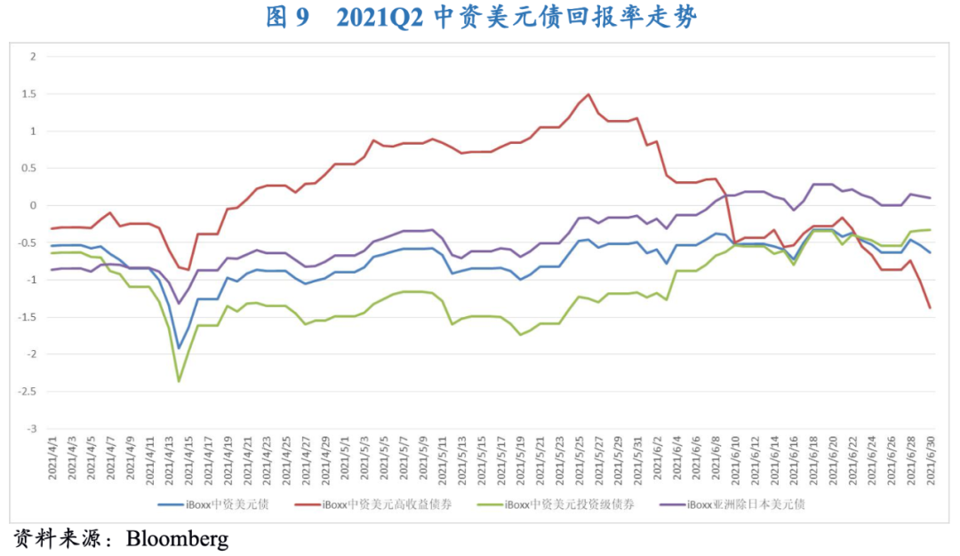 2021年二季度信用風險事件繼續發酵,拖累中資美元債收益表現。二季度,Markit iBoxx中資美元債指數總回報率繼續保持在負值區間,為-0.1%,環比收窄0.6個百分點,主要是因為5-6月投資級中資美元債再美國市場流動性寬裕環境下呈現反彈,投資者風險情緒得到小幅緩解。其中,恒大以及藍光等負面消息再次打擊市場情緒,對高收益地產板塊產生溢出效應,加之融資監管持續收緊,高收益中資美元債二季度回報率繼續下跌至-1.1%,環比和同比分別降低了0.4個和10.4個百分點;投資級中資美元債本季度回報率由負轉正,為0.3%,主要是因為非金融機構表現相對穩定,對投資級收益率起到提振作用。
