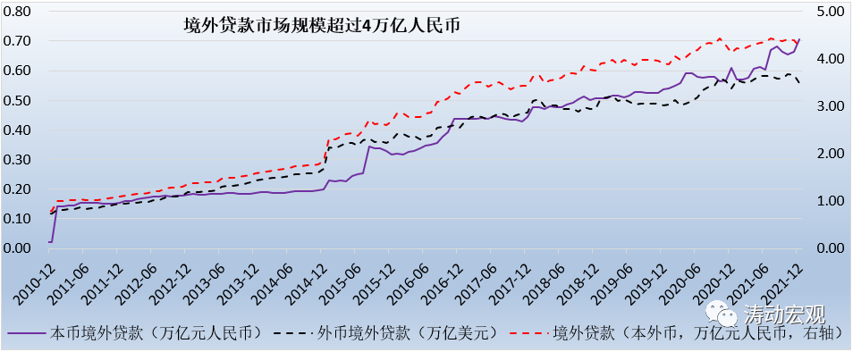 截至2021年底,金融機(jī)構(gòu)的本外幣境外貸款余額達(dá)到4.26萬億元人民幣,占全部本外幣貸款的比例只有2.20%,可以看出市場(chǎng)空間實(shí)際上還未完全打開。同時(shí)我們看到,4.26萬億的本外幣境外貸款中,本幣境外貸款余額只有0.70萬億,占比僅有16.55%,也即83.45%的本外幣貸款由外幣貸款構(gòu)成(余額達(dá)到0.56萬億美元),因此相較而言,我們認(rèn)為本幣境外貸款的市場(chǎng)空間需要進(jìn)一步打開。