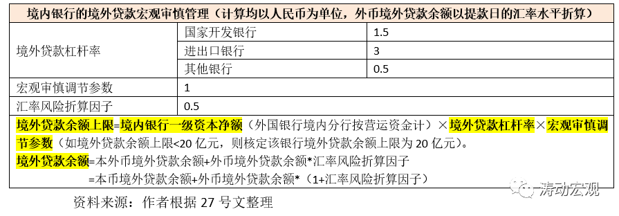 (二)27號(hào)文主要通過各行一級(jí)資本凈額(或營運(yùn)資金)、境外貸款杠桿率和宏觀審慎調(diào)節(jié)參數(shù)來設(shè)置境外貸款余額上限。