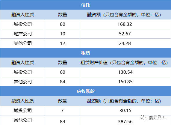 根據DM的統計信息,2021年4月18日-5月14日,發行過債券的城投公司在約一個月內,共實現了147筆非標融資,合計金額為329.01億元,超過300億元!其中:城投公司實現了80筆信托融資,合計金額為168.32億元;實現了60筆融資租賃融資,合計金額為130.54億元;實現了應收賬款融資7筆,合計金額為30.15億元。