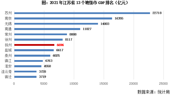 2021年,揚州GDP6696億元,在江蘇省13個地級市排名第七位,同比增長7.4%。城鎮(zhèn)居民人均可支配收入50947元,在全省排名第八位,同比增長7.9%。2020年,揚州常住人口456萬人,在全省排名第十位,其中城鎮(zhèn)常住人口324萬人,城鎮(zhèn)化率71%。