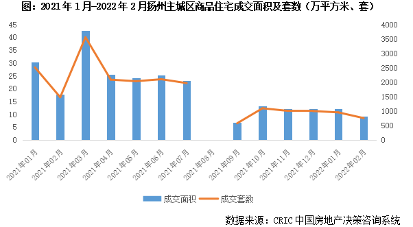 2021年1-7月,揚州房地產(chǎn)市場相較火爆,主城區(qū)商品住宅月均成交面積約27萬平方米。尤其是3月,成交面積多達43萬平方米,創(chuàng)2019年以來單月新高。8月,受疫情影響,揚州房地產(chǎn)市場陷入停擺。9月以來,揚州市場持續(xù)轉(zhuǎn)冷,成交大幅下滑,月均成交跌至11萬平方米,較1-7月月均下降59%。在售項目成交去化顯著放緩,新開盤項目平均去化率由43%跌至18%,流量盤月均成交20-30套,滯銷盤月均成交不足10套。