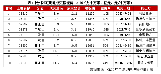 2020年、2021年上半年揚州土拍市場異?;鸨赝鯓前鍍r超1.4萬元/平方米。例如2020年7月24日,頤居建設(shè)總價12.2億元競得廣陵區(qū)GZ210地塊,樓板價14250元/平方米,創(chuàng)全市新的單價地王,溢價率高達110%。