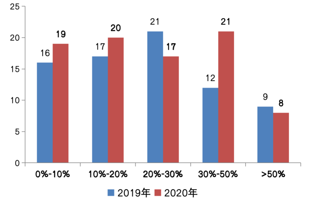 值得注意的是,雖然行業整體的下行壓力較大,但受益于2020年下半年市場回暖以及企業推貨、去化力度的加大,2020年全年業績增速在30%-50%之間的房企數量較2019年的12家大幅增加至21家。這部分高增速企業主要集中在不足千億的中等規模房企中,對規模訴求更高,且21家房企中14家企業的增速在2019年的基礎上有進一步提升。