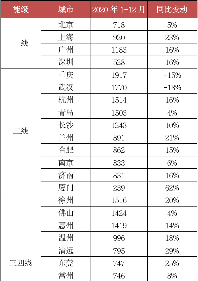 從2020年市場成交來看,一線城市表現出較強的韌性,全面趨好;二線城市內部分化加劇,跌多漲少,杭州、蘭州、濟南、合肥、廈門等部分城市熱度較高;三四線城市整體表現基本持穩,珠海、東莞、江陰、宜興等城市成交突出。