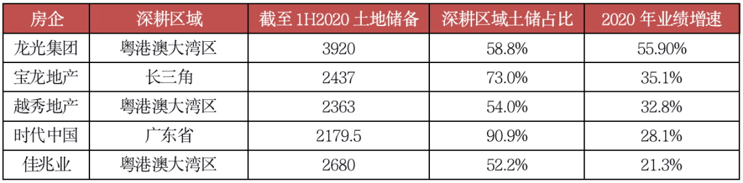 在國家發展規劃的政策利好下,長三角、粵港澳大灣區等城市區域經濟向好,帶動區域樓市熱度的提升。在此背景下,區域深耕型房企在競爭中優勢凸顯,尤其是深耕重點城市群的房企,例如寶龍深耕長三角,截至2020年中期于長三角的土儲建面達1779萬平方米,2020年全年業績增速達35.1%。