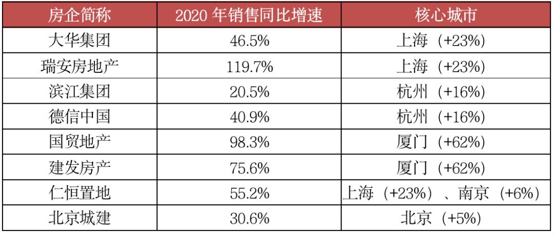 從2020年房企增長路徑來看,一些房企就受益于布局城市的市場機會,通過加快推盤供貨,推高業績增長,此類房企大多具備本土或深耕核心城市的特質,從而借勢而上,典型如濱江集團、大華集團、國貿地產、北京城建、仁恒置地等。