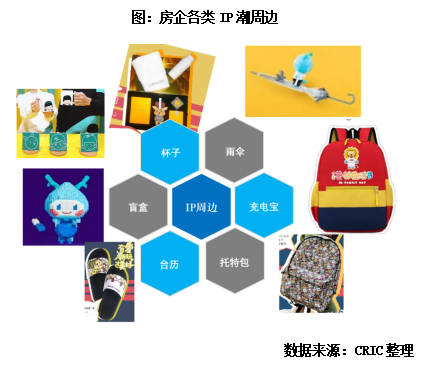 再次,需豐富IP形象周邊產品,增加IP消費力。周邊是對品牌文化的延伸和完善,尤其是可以吸引年輕消費群體的注意力,更容易進行傳播,為品牌帶來不少的流量。很多地產品牌周邊已經不再局限于只設計一個毛絨公仔或抱枕,雨傘、充電寶、托特包、臺歷、盲盒甚至雪糕模具等產品都有出現,還有房企通過旗下商業地產打造“快閃店”等方式售賣及贈送IP形象周邊,滿足Z世代潮流IP消費。