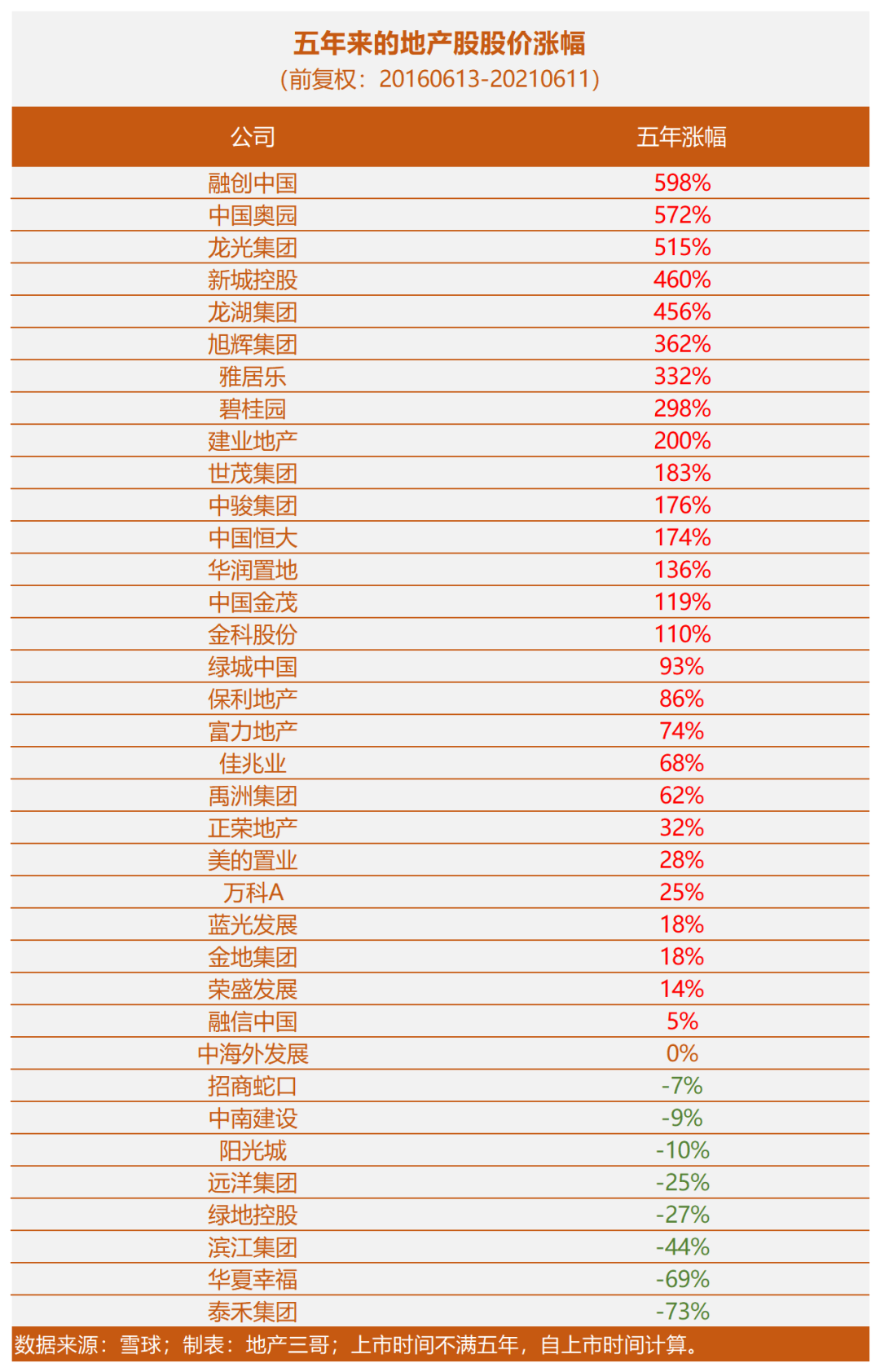 融創,這五年是地產股價漲幅的老大,598%。融創的股價主要漲在2017年,如果沒有后期的新政,老孫這個筋斗云,可能還要飛得更高。