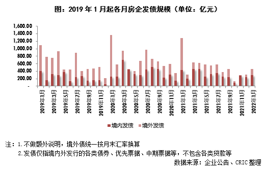1月發(fā)債457.20億元,環(huán)比上升44.7%,同比下降64.3%。其中,境外發(fā)債166.40億元,環(huán)比上升118.5%,同比下降80.5%,主要在于當(dāng)前仍有房企境外債出現(xiàn)違約情況,投資者信心不足,境外發(fā)債相對(duì)較難,而在發(fā)行境外債的企業(yè)中,有相當(dāng)一部分企業(yè)是尋求債券要約交換,真正實(shí)現(xiàn)新債或者舊債再循環(huán)融資的企業(yè)相對(duì)較少。境內(nèi)發(fā)債290.90億元,環(huán)比上升21.3%,同比下降32.3%,其中,公司債發(fā)行68.0億元,同比下降76.3%,環(huán)比下降32.7%;中期票據(jù)發(fā)行143.9億元,環(huán)比上升63.7%,同比上升157.9%;融資券發(fā)行78.9億元,環(huán)比上升55.0%,同比上升13.2%。