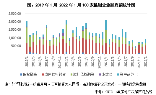 2022年1月100家典型房企的融資總量為929.46億元,環(huán)比上升26%,同比下降56%。自2019年以來,每年年初房企融資量都相對(duì)較大,均超過2000億元,而本月融資量不足千億元,一方面在當(dāng)前房企危機(jī)仍未全面解除的情況下,金融機(jī)構(gòu)當(dāng)前白名單企業(yè)相對(duì)較少,放款較為謹(jǐn)慎;另一方面,部分企業(yè)為緩解年初的償債壓力已提前償還債券,同時(shí)也減少新增融資計(jì)劃,導(dǎo)致融資量同比下滑較大。從融資結(jié)構(gòu)來看,境內(nèi)債權(quán)融資499.08億元,環(huán)比上升9.8%,同比下降24.6%;境外債權(quán)融資169.66億元,環(huán)比上升10.0%,同比下降80.1%;本月資產(chǎn)證券化有所回升,融資223.01億元,環(huán)比上升97.9%,同比下降63.0%。