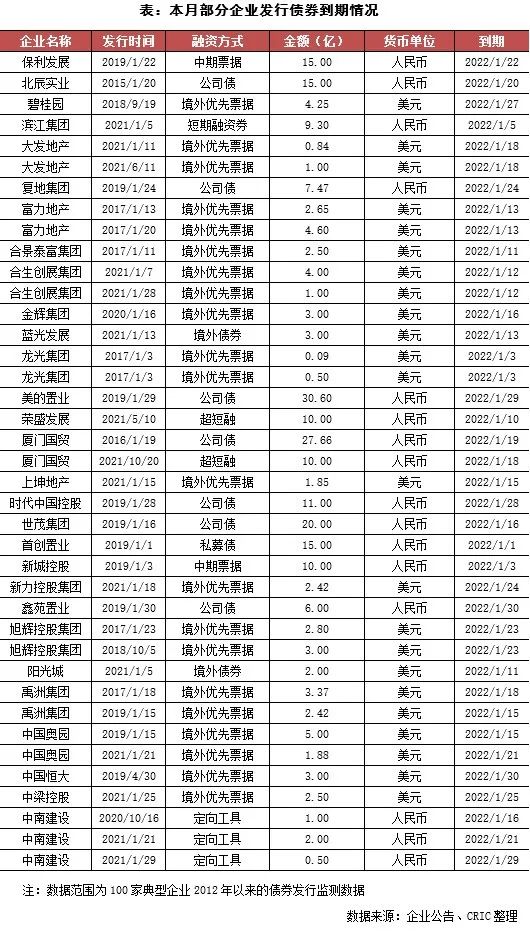 本月房企有39筆債券到期,金額共計(jì)594.22億元,環(huán)比上升77.0%,到期債券只數(shù)環(huán)比增加8只,年初企業(yè)的償債壓力較大。到期金額最高的債券為中國奧園2019年1月發(fā)行的一筆5億美元的境外優(yōu)先票據(jù),但其于1月19日公告稱將不會(huì)支付于2022年1月到期票據(jù)的余下本金及最后一期利息,債務(wù)違約。值得注意的是,本月有上坤和榮盛發(fā)展就企業(yè)存續(xù)期境外債完成了部分債券的交換要約,相當(dāng)于2022年1月到期的債券到期時(shí)間已經(jīng)成功延期。