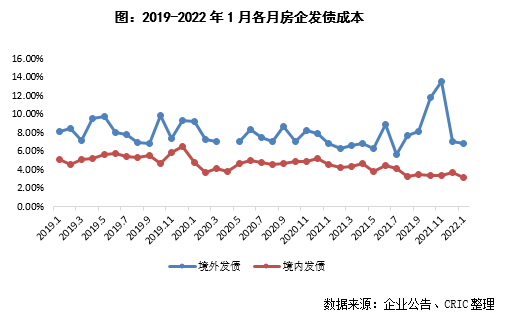2022年1月100家典型房企新增債券類融資成本4.53%,較2021年全年下降0.76pct,其中境外債券融資成本達(dá)6.85%,下降0.19pct,境內(nèi)債券融資成本3.20%,下降0.87 pct。環(huán)比2021年12月來看,總?cè)谫Y成本環(huán)比上升0.01pct,境外融資成本環(huán)比下降0.16pct,境內(nèi)融資成本環(huán)比下降0.53pct。境內(nèi)發(fā)債的企業(yè)中,可以進(jìn)行發(fā)債的企業(yè)成本相對(duì)較低,融資利率在2.50%-4.00%間,白名單企業(yè)繼續(xù)發(fā)揮融資優(yōu)勢(shì),繼續(xù)發(fā)行利率較低的債券;境外發(fā)債成本方面,旭輝、遠(yuǎn)洋等發(fā)行了綠色擔(dān)保票據(jù),其成本不超過5%,也相對(duì)較低,還有部分企業(yè)完成了境外債的交換要約和額外發(fā)行,成本相對(duì)較高。
