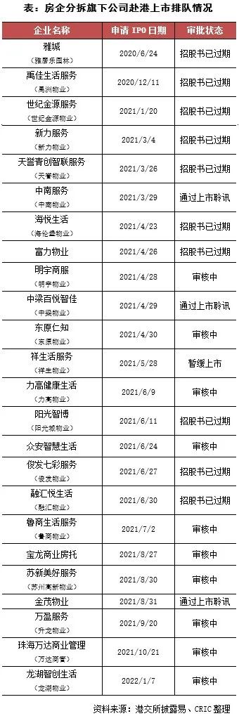 在房企分拆旗下公司上市方面,本月7日龍湖智創(chuàng)生活向港交所首次遞交了招股說明書,此外魯商生活服務(wù)和眾安智慧生活也分別在18日和30日更新了招股書。因此截至2022年1月底,在港交所遞交過招股書而仍未上市的房企旗下公司共有24家,其中有多家企業(yè)的招股書都已過期,未來是否還會(huì)堅(jiān)持上市有待觀察。除此之外,期后金茂物業(yè)在2月6日通過了上市聆訊,有可能很快就會(huì)完成IPO。