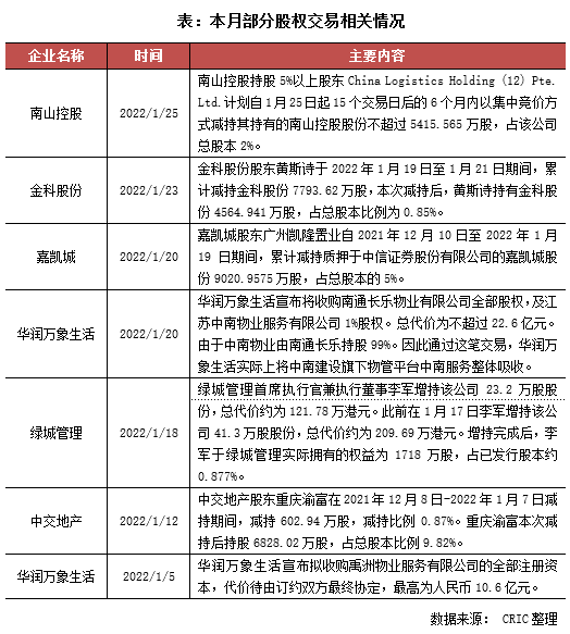 本月沒有房企和房企旗下公司完成上市,在遞表方面,本月7日龍湖智創(chuàng)生活首次向港交所遞交了招股書,同時(shí)魯商生活服務(wù)和眾安智慧生活都對(duì)招股書進(jìn)行了更新。因此截至2022年1月底,在港交所提交過招股書但仍未上市的房企和房企旗下公司分別有12家和24家。此外值得注意的是本月出現(xiàn)了較多的收并購事件,比如華潤萬象生活就在月內(nèi)連續(xù)并購了兩家大型物管企業(yè),在物管行業(yè)和房地產(chǎn)行業(yè)收并購機(jī)會(huì)浮現(xiàn)的背景下,疊加政府對(duì)于房企收并購的政策和金融支持,未來可能會(huì)浮現(xiàn)一波并購潮。