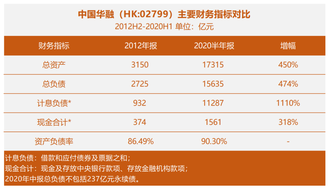 經過二十多年的擴張,華融已經發展成為集各類金融牌照于一身的金融平臺。2020年上半年,中國華融總資產1.73萬億,總負債1.56萬億,資產負債率90.3%。