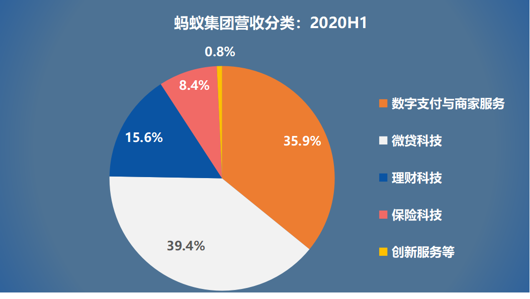 數字支付商戶服務收入和科技平臺業務(微貸+理財+保險)收入,在2020年半年報中,750億左右的營業收入中兩者的比例約為35:65。