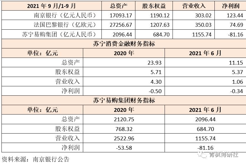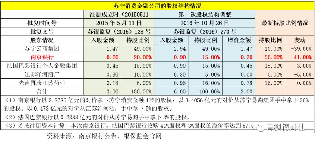 2、南京銀行通過本次收購,拿下蘇寧消費金融41%的股權。其中,以3.4056億元的對價從蘇寧易購集團手中拿下36%的股權,以0.473億元的對價從江蘇洋河酒廠手中拿下5%的股權。