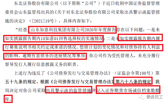 債券民工昨天在債券存續期受托管理很重要!兩家證券公司受處罰!一文中關注到,華西證券和宏信證券因債券存續期受托管理事項被證監會四川監管局處罰,今天就又看到了東北證券股份有限公司的公告,因未充分履行督導山東如意科技集團有限公司2020年年度報告披露義務,被證監會山東監管局局出具警示函的監管措施。