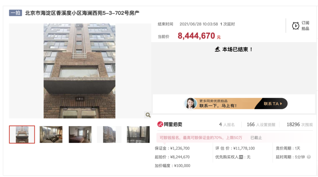 比如這兩天剛結(jié)束的一套北京市海淀區(qū)香溪度小區(qū)的房產(chǎn),涉案房產(chǎn)系沒(méi)收上繳國(guó)庫(kù)財(cái)產(chǎn)。起拍價(jià)為824萬(wàn)元,市場(chǎng)價(jià)1320萬(wàn)元,保證金為123.67萬(wàn)元,4人報(bào)名,18029人圍觀,3次出價(jià),最終以高于起拍價(jià)20萬(wàn)元,總價(jià)844萬(wàn)元成交,低于市場(chǎng)價(jià)近500萬(wàn)。