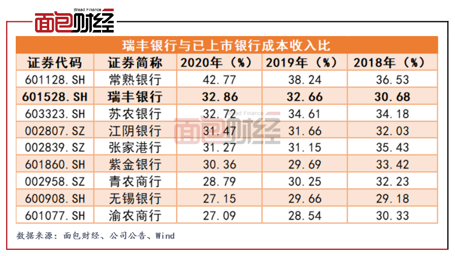 但值得注意的是,瑞豐銀行的成本收入比一直處于較高水平。截至2020年末,該行的成本收入比為32.86%,較上年末相比上升0.2個(gè)百分點(diǎn)。與已上市農(nóng)商行相比,僅次于常熟銀行,排在第二位。