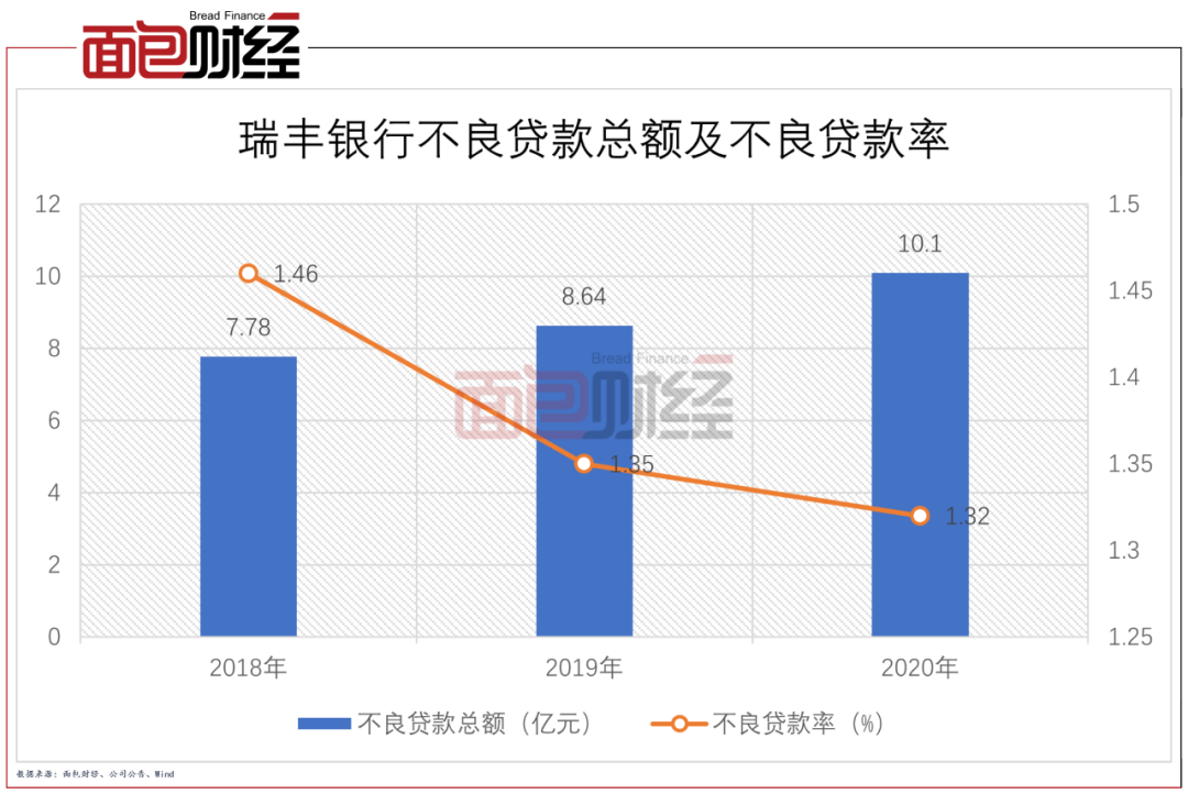 截至2020年末,瑞豐銀行的總資產(chǎn)為1295.16億元,較上年末增長(zhǎng)17.83%。2021年一季末,該行的總資產(chǎn)已達(dá)1328.83億元。資產(chǎn)規(guī)模的不斷擴(kuò)大,與該行增加信貸投放有直接關(guān)系。