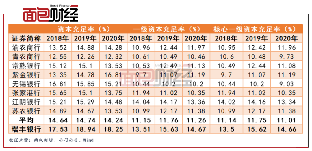 截至2020年末,瑞豐銀行的資本充足率為18.25%;一級(jí)資本充足率為14.67%;核心一級(jí)資本充足率為14.67%。與其他已上市農(nóng)商行相比,瑞豐銀行的資本充足率水平不僅處于較高水平,且高于可比上市銀行平均值。