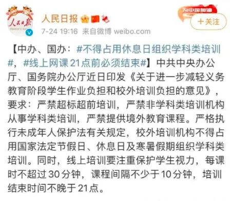 今年7月,中央辦公廳、國務院辦公廳印發了《關于進一步減輕義務教育階段學生作業負擔和校外培訓負擔的意見》的通知,對教培機構的上課時間、內容,做出了極為嚴格的限制。