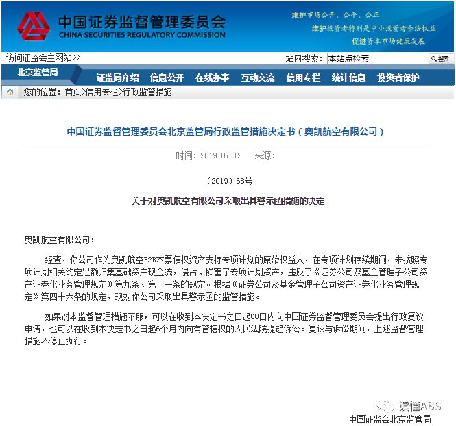 2019年4月8日,中國證監會遼寧監管局連開4張ABS警示函,對慶匯租賃一期資產支持專項計劃(簡稱“慶匯租賃ABS”)原始權益人、計劃管理人、律師事務所、評級機構逐一出具了警示函。具體理由如下: