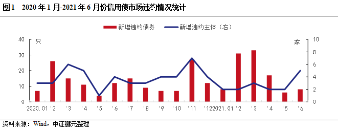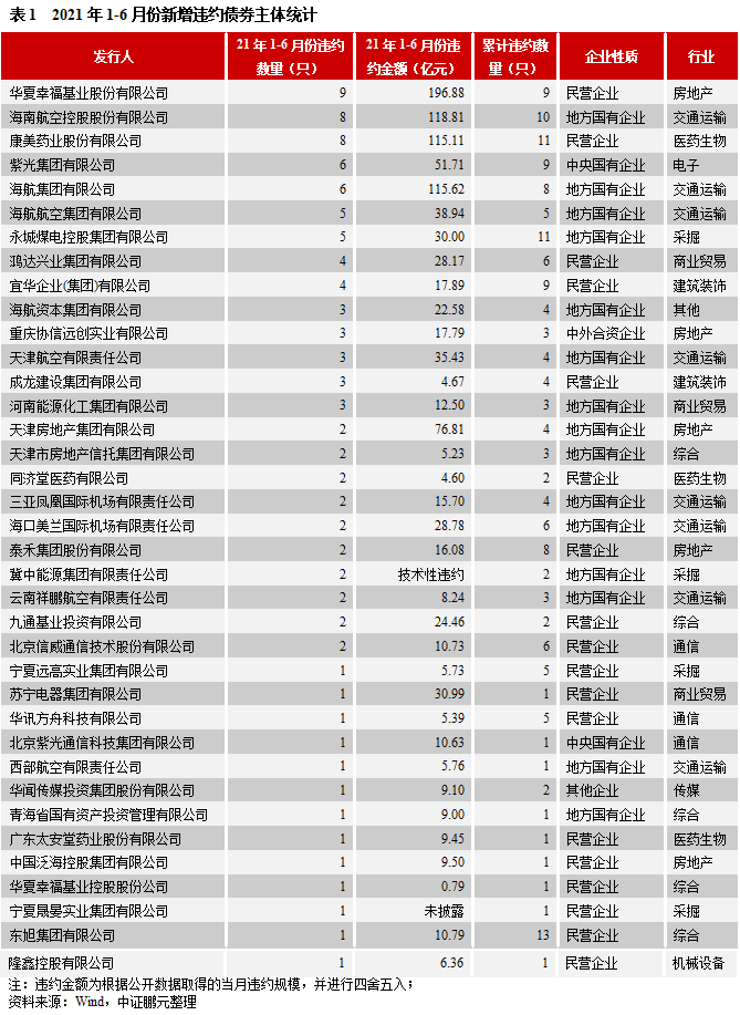 2021年上半年,延續2020年下半年的違約趨勢,新增違約主體風險在前期已有所顯現。新增違約債券103只,違約規模約1,110億元,涉及37家發行人。其中,新增違約主體16家,違約債券35只,占比34%。與上年同期相比,新增違約債券增長37%,新增違約主體下降27%,主要是海航系、華夏幸福等大型企業出現流動性危機,進入債務重組,使得2月和3月違約債券增量較多。